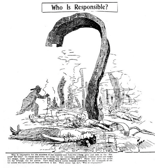 “Who is responsible? Who is responsible for the murders of one hundred and forty-five young girls and men in the ‘fire proof’ fire trap? On whose head rests the blame for the inadequate, antiquated, criminal stairs and single fire escape, made possible because the building was classed as ‘fireproof’? These dead girls cry aloud, not for revenge, but for justice. Their flame-racked bodies demand protection for the thousands of sister toilers who have not yet been sacrificed to fire. Their silent lips call, ‘Who is responsible?’”